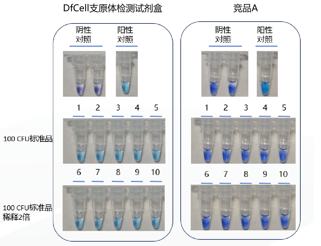 图2. DfCell支原体高敏快速检测试剂盒(LAMP)与竞品A检测结果对比